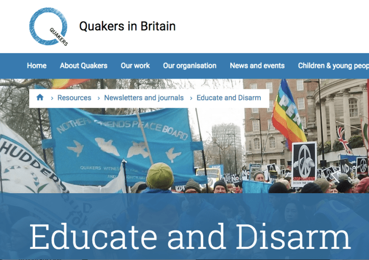 If you want to be kept up to date on the Quaker peace testimony a very good source is Friends House’s Educate and disarm web site and newsletter. It’s full of activity, events and resources such as campaigns on