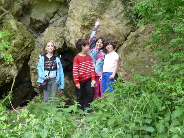 On we went through a small orchard where we found a badger sett and the children explored a cave. Then down into the beautiful little valley of Smallcombe where we listened to birdsong of blackcaps and greenfinches, and visited the old cemetery with its lichen covered gravestones. Over 100 species of lichen have been found here. Wild garlic was prolific in the adjacent woods.