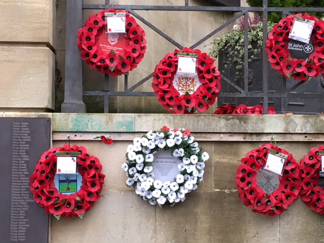 UPDATE – 17 Nov 2017 The white poppy wreath is still there, but subtly altered with the sensitive and welcome addition by persons unknown of a few red poppies: see picture.