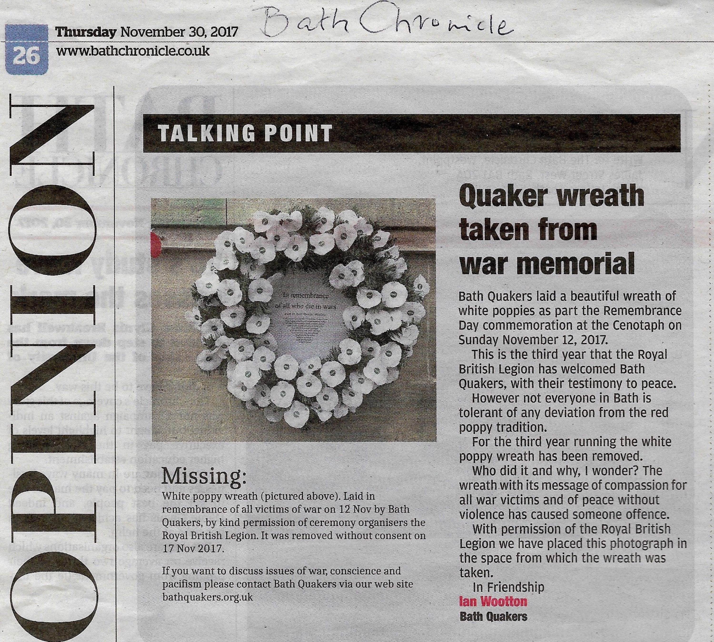 Ian Wooton’s prominent Bath Chronicle letter last month. The sign about the wreath being stolen (left in the picture) has now itself been stolen.
