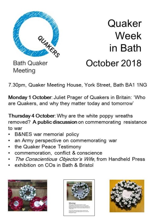 Quaker Week in early October includes two public events in Bath at the Friends Meeting House in York Street.