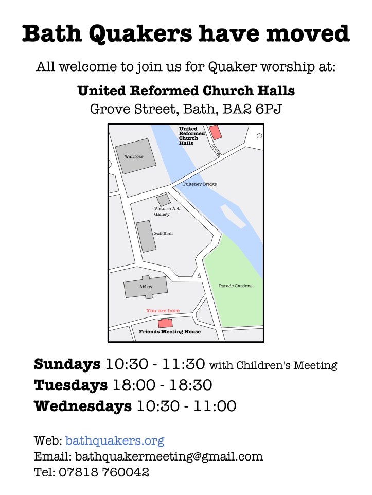 Keep up everyone! We’re a growing Meeting, ever more active in the world. After more than 150 years on York Street, we find that our needs and priorities have changed. So we’ve moved – and changed times too – see below.