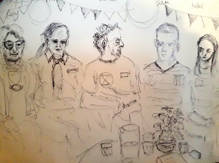 The Quaker Any Questions panel captured in a sketch on the night. Artist: Gaie