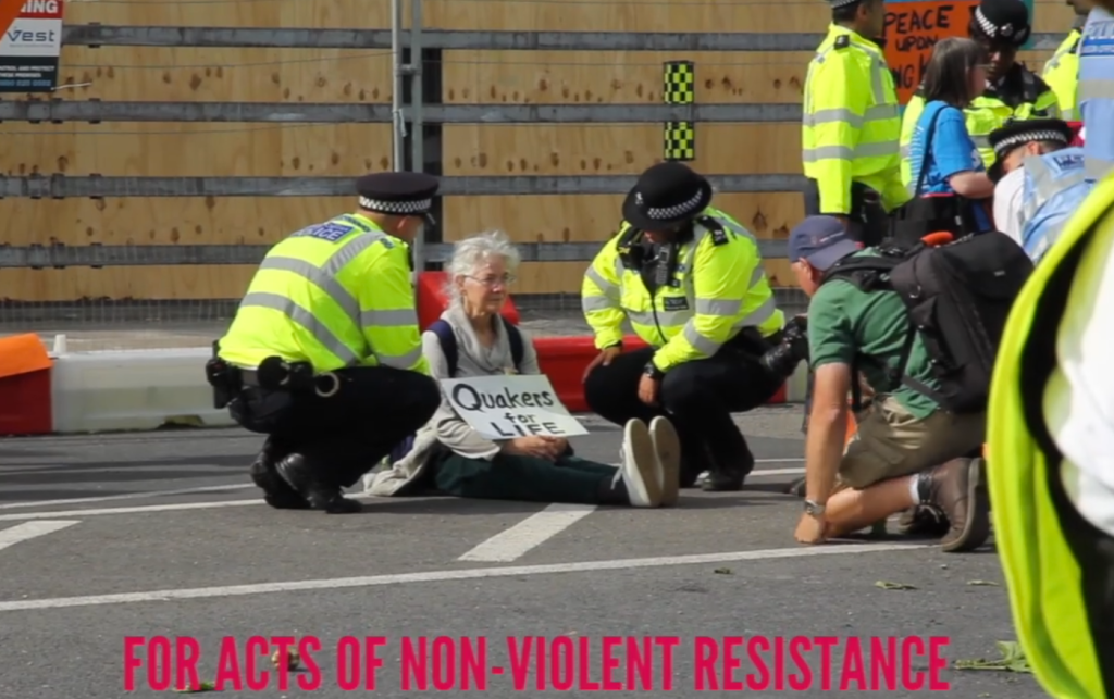 during the process of arrest. Obeying the advice not to comment to the police, I decided not to respond at all when they were warning me, which for me was difficult, but truly peaceful, and only made possible by avoiding eye contact completely. It was an eerie silence, a Quaker stillness. The police were disconcerted, not knowing if I was deaf or mentally unaware. Finally they gave up and arrested me.
