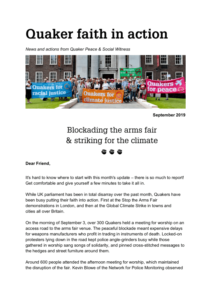 Christine Goodgame-Nobes forwards the excellent Quaker Faith in Action newsletter from Quaker Peace & Social Witness (QPSW). “This is a good one!” she says. She’s quite right, and they regularly are.