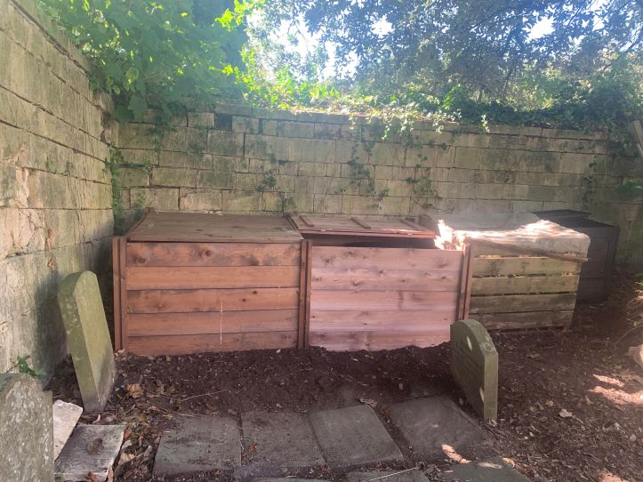 Susan Tomes writes to report all action at the Burial Ground. There’s a new composting area with three large wooden composting bins: one for new green waste; one for waste in the process of becoming compost; and one ready to use as compost. There’s also a small black bin for perennial weeds like bindweed and ground elder.