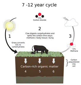 All ruminants burp out methane, both livestock and wild species. But ruminant methane does not add methane or carbon to the atmosphere, because it is part of the biogenic (fast) carbon cycle [4] [5]. In fact, pasture-reared cattle help to draw down carbon from the atmosphere and store it beneficially in the soil (carbon sequestration). Consider humans: Like all animals we breathe out CO2, but the IPCC[6] does not count this as a greenhouse gas (GHG). It is just a flux gas that cycles in and out of the atmosphere. Plants draw down CO2 from the atmosphere and use this carbon to make sugars and other carbohydrates to grow roots, stems and leaves. We eat the plants or we eat the animals that eat the plants, and CO2 is a byproduct of our food metabolism. It just replaces the atmospheric CO2 that the plants extracted. This is very different from the slow carbon cycle that takes billions of years to form fossil fuels. Ruminant methane (CH4) is also a flux gas. This methane carbon also comes from CO2 drawn down by the plants that the cow ate. The methane rapidly breaks back down to carbon dioxide in the atmosphere, and this replaces just some of the CO2 that the plants removed. Some of the carbon is diverted into the soil (carbon sequestration) via the cow dung and the sugars that the grass roots exude. So pasture and grazing livestock like cows and sheep contribute to a net reduction in atmospheric carbon.